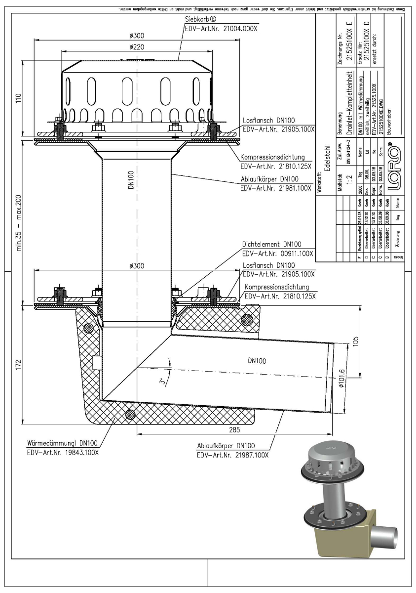 LORO-X DRAINLET Flachdachablauf, Serie 84(DL) zweiteilig mit Wärmedämmung, Auslauf seitlich 3 Grad, für Hauptentwässerung mit Freispiegelströmung, Abflussleistung 6,1 l/s bei 35 mm Wasserhöhe auf dem Dach, mit Klemmflansch als Los- und Festflanschkonstruktion inklusive Kompressionsdichtungen, für Bitumen- und Kunststoff- Abdichtungsbahnen, DRAINLET-Haube aus Edelstahl, nach DIN EN 1253 mit erhöhtem Qualitätsstandard gemäß RAL-Gütezeichen GZ-694, Leistungsnachweis mit normgerechtem Prüfsystem mit 4,2m nicht belüfteter Fallleitung gemäß LX-Datenblatt LX855, aus Edelstahl, DN 100