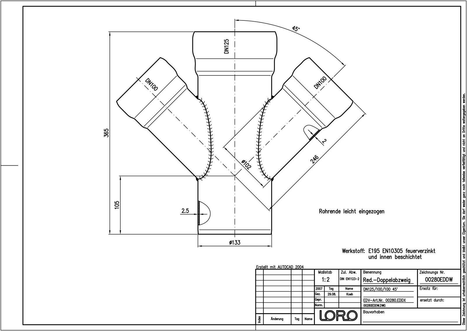 LORO-X Red.-Doppelabzweig, aus Stahl, feuerverzinkt, nach DIN EN 1123 mit erhöhtem Qualitätsstandard gemäß RAL-Gütezeichen GZ-694, mit 2-Kammern-Steckmuffenverbindung, Baustoffklasse A1, formstabil, bruchfest, rückstausicher, langlebige Innenbeschichtung gemäß DIN EN ISO 2178 auf Basis einer 2K-Epoxid-Kombination, Farbton: Rotbraun, 45 Grad, DN 125/100/100