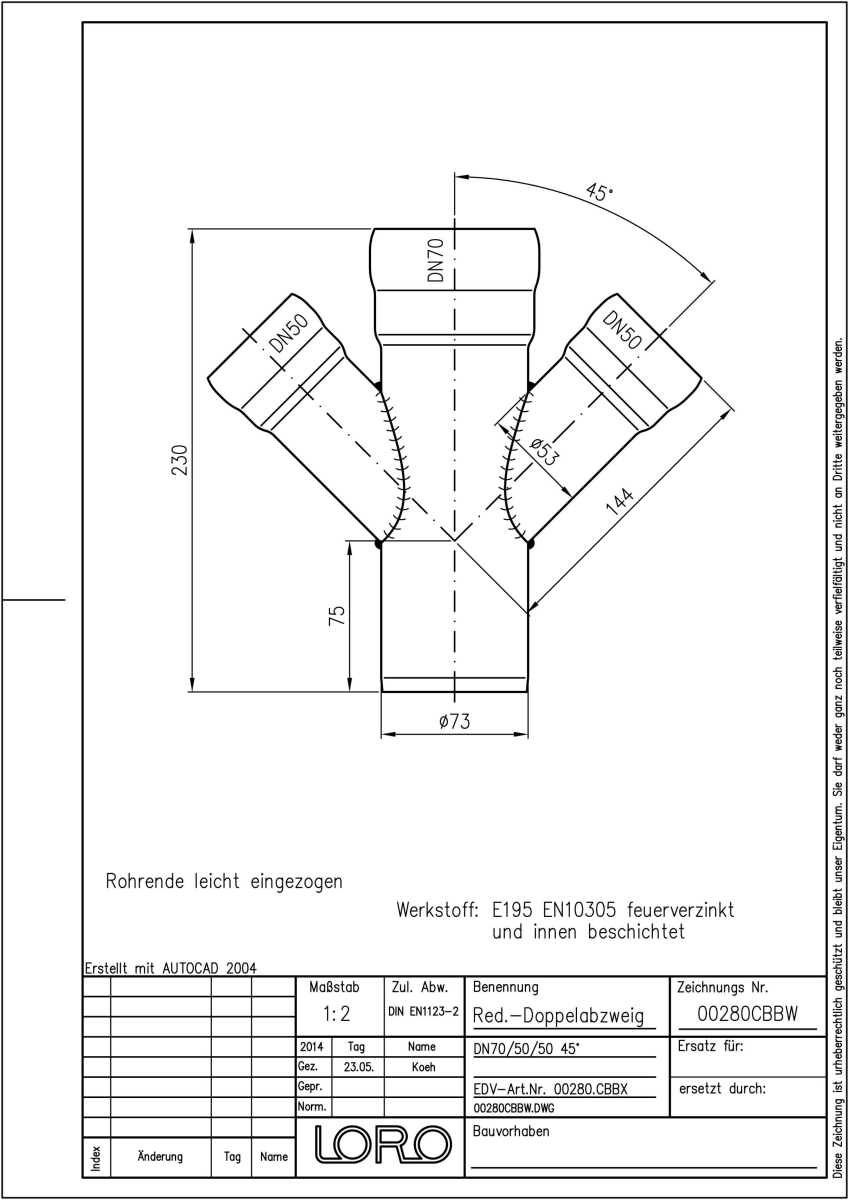 LORO-X Red.-Doppelabzweig, aus Stahl, feuerverzinkt, nach DIN EN 1123 mit erhöhtem Qualitätsstandard gemäß RAL-Gütezeichen GZ-694, mit 2-Kammern-Steckmuffenverbindung, Baustoffklasse A1, formstabil, bruchfest, rückstausicher, langlebige Innenbeschichtung gemäß DIN EN ISO 2178 auf Basis einer 2K-Epoxid-Kombination, Farbton: Rotbraun, 45 Grad, DN 70/50/50