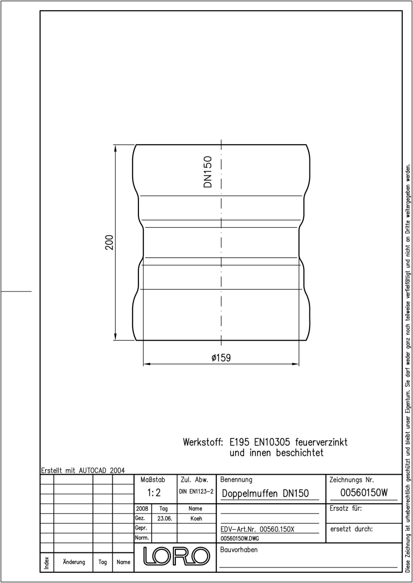 LORO-X Doppelmuffe, aus Stahl, feuerverzinkt, nach DIN EN 1123 mit erhöhtem Qualitätsstandard gemäß RAL-Gütezeichen GZ-694, mit 2-Kammern-Steckmuffenverbindung, Baustoffklasse A1, formstabil, bruchfest, rückstausicher, langlebige Innenbeschichtung gemäß DIN EN ISO 2178 auf Basis einer 2K-Epoxid-Kombination, Farbton: Rotbraun, DN 150