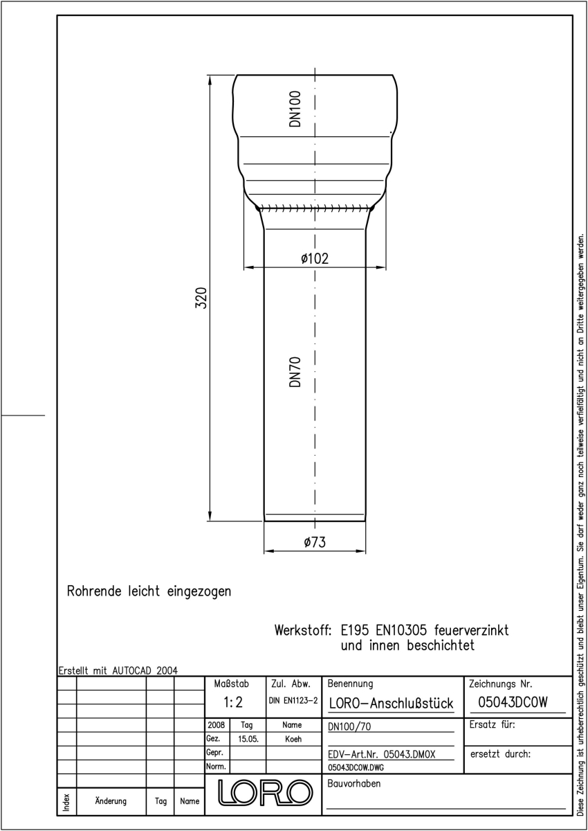 LORO-DRAINJET Anschlussstück nach DIN EN 1123 mit erhöhtem Qualitätsstandard gemäß RAL-Gütezeichen, mit 2-Kammern-Steckmuffenverbindung, aus Stahl, feuerverzinkt, Baustoffklasse A1, formstabil, bruchfest, rückstausicher, langlebige Innenbeschichtung gemäß DIN EN ISO 2178 auf Basis einer 2K-Epoxid-Kombination, Farbton: Rotbraun, DN 100/70