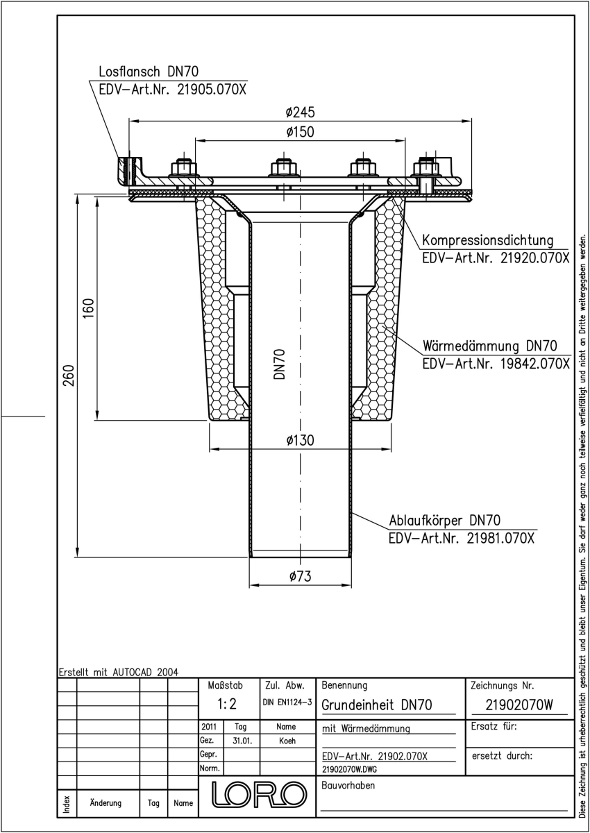 LORO-DRAINJET/LET Flachdach-Schnellablauf Grundeinheit, für Druckströmung mit planmäßiger Vollfüllung und Freispiegelströmung, nach DIN EN 1253 mit erhöhtem Qualitätsstandard gemäß RAL-Gütezeichen, mit Klemmflansch, als Los- und Festflanschkonstruktion, aus Edelstahl, Auslauf senkrecht, mit Wärmedämmung, einteilig, bestehend aus Ablauftopf, Losflansch, einschließlich Kompressionsdichtungen, DN 70