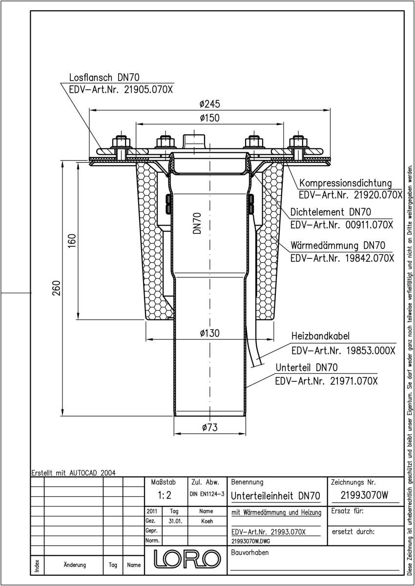 LORO-DRAINLET/JET Flachdachablauf-Unterteileinheit, für Freispiegelströmung, nach DIN EN 1253 mit erhöhtem Qualitätsstandard gemäß RAL-Gütezeichen, mit Klemmflansch, als Los-und Festflanschkonstruktion, aus Edelstahl, Auslauf senkrecht, mit Wärmedämmung und Heizung, bestehend aus Unterteil mit Wärmedämmung und Heizung, Losflansch und Dichtelement, DN 70