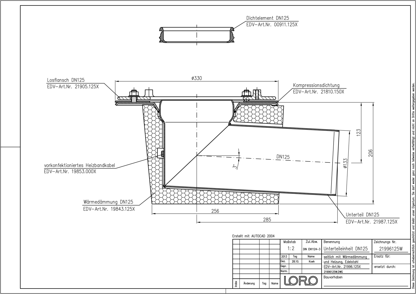 LORO-DRAINLET Flachdach-Schnellablauf Unterteileinheit, für Druckströmung mit planmäßiger Vollfüllung, nach DIN EN 1253 mit erhöhtem Qualitätsstandard gemäß RAL-Gütezeichen, mit Klemmflansch, als Los- und Festflanschkonstruktion, aus Edelstahl, Auslauf seitlich, mit Wärmedämmung und Heizung, einteilig, bestehend aus Unterteil, Losflansch, einschließlich Kompressionsdichtungen, Dichtelement, DN 125