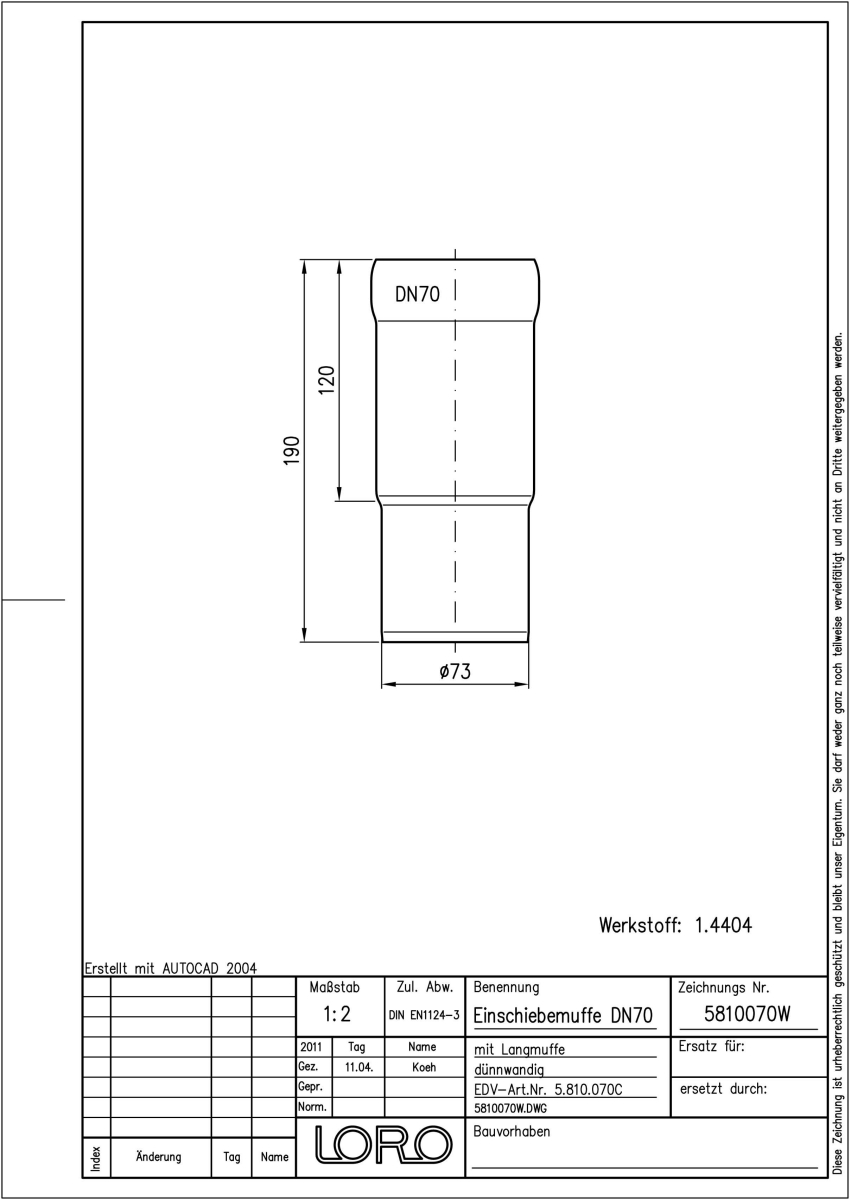 LORO-XCL Einschiebmuffe mit Langmuffe, aus Edelstahl, Werkstoff Nr. 1.4404, gebeizt und passiviert, nach DIN EN 1124 mit erhöhtem Qualitätsstandard gemäß RAL-Gütezeichen GZ-694, mit 2-Kammern-Steckmuffenverbindung, Baustoffklasse A1, formstabil, bruchfest, rückstausicher, DN 70