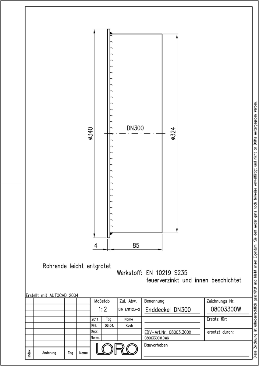 LORO-X Enddeckel für LORO-XML Stahlabflussrohre, muffenlos, aus Stahl, feuerverzinkt, nach DIN EN 1123 mit erhöhtem Qualitätsstandard gemäß RAL-Gütezeichen GZ-694, Baustoffklasse A1, formstabil, bruchfest, rückstausicher, langlebige Innenbeschichtung gemäß DIN EN ISO 2178 auf Basis einer 2K-Epoxid-Kombination, Farbton: Rotbraun, Zulassung Nr. Z-42.1-346 vom DIBt, DN 300