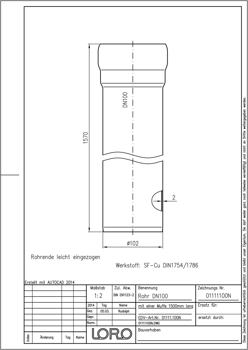LORO-N Regenfallrohr, aus Kupfer nach DIN 1754/1786 rund, mit erhöhtem Qualitätsstandard gemäß RAL-Gütezeichen GZ-694, mit 2-Kammern-Steckmuffenverbindung, Baustoffklasse A1, formstabil, bruchfest, rückstausicher, 1500 mm, + 1 Muffe, DN 100