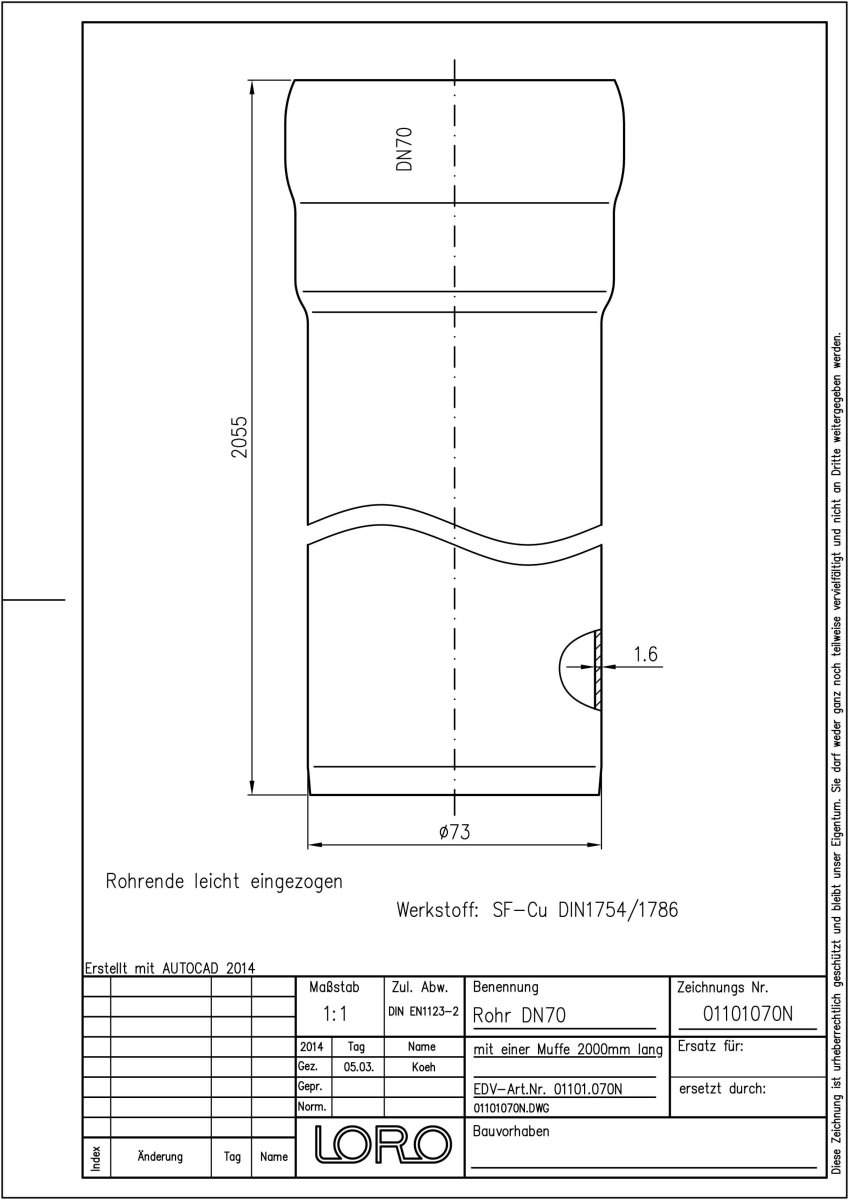 LORO-N Regenfallrohr, aus Kupfer nach DIN 1754/1786 rund, mit erhöhtem Qualitätsstandard gemäß RAL-Gütezeichen GZ-694, mit 2-Kammern-Steckmuffenverbindung, Baustoffklasse A1, formstabil, bruchfest, rückstausicher, 2000 mm, + 1 Muffe, DN 70