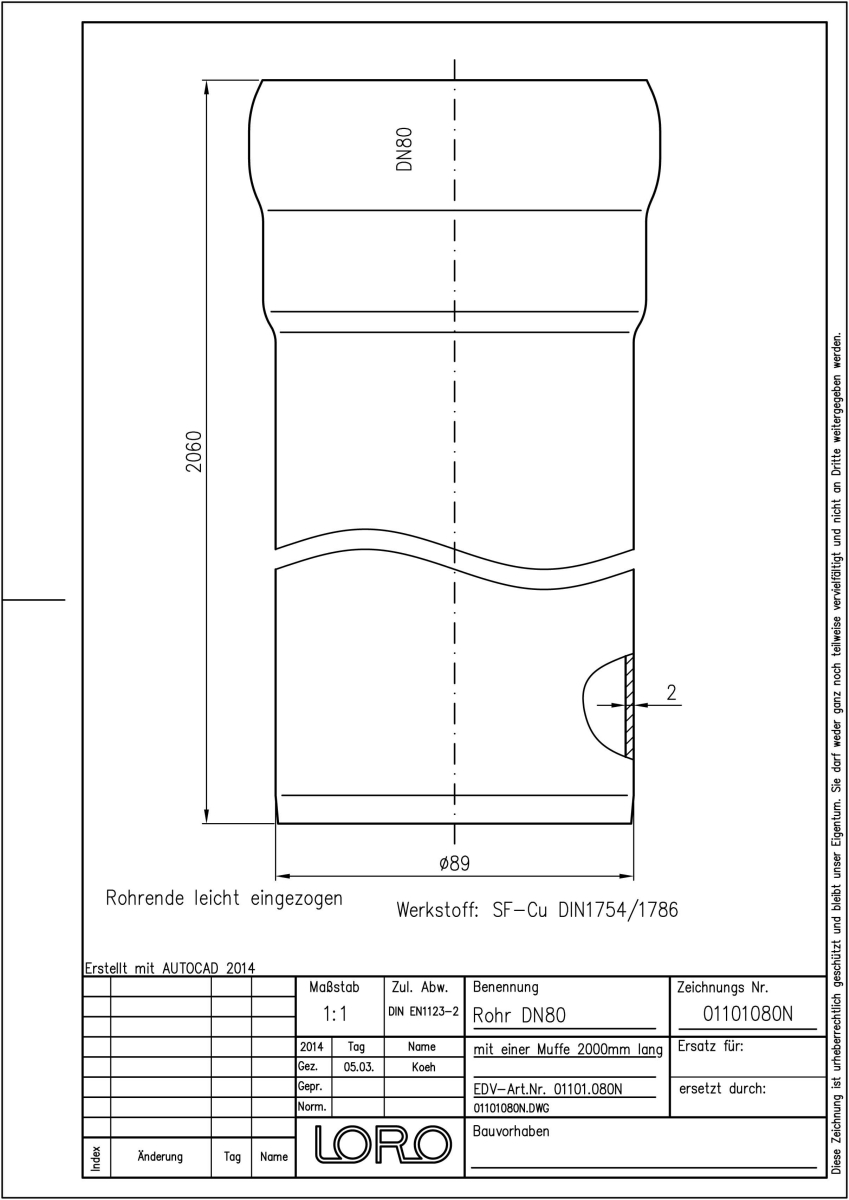 LORO-N Regenfallrohr, aus Kupfer nach DIN 1754/1786 rund, mit erhöhtem Qualitätsstandard gemäß RAL-Gütezeichen GZ-694, mit 2-Kammern-Steckmuffenverbindung, Baustoffklasse A1, formstabil, bruchfest, rückstausicher, 2000 mm, + 1 Muffe, DN 80