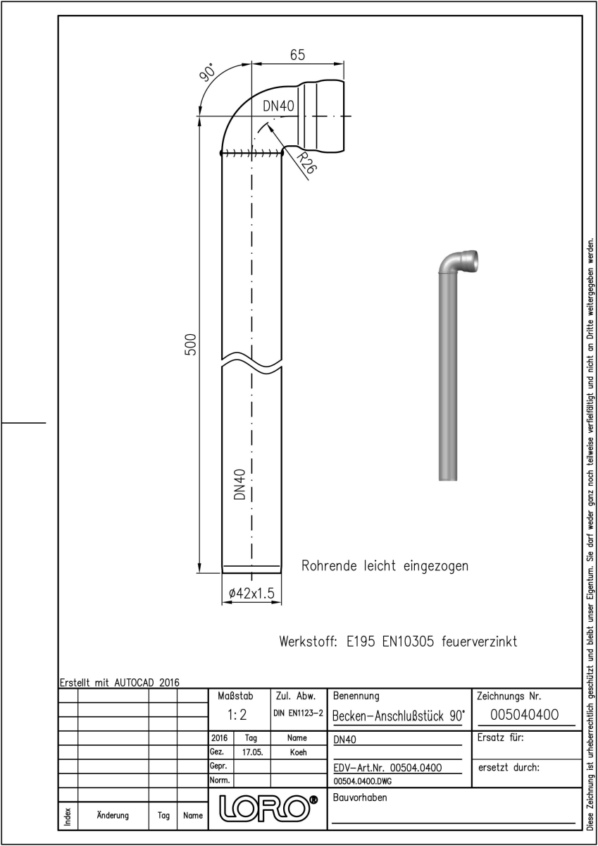 DN 40, 50cm, 90°, z. Wanddurchf., fvz