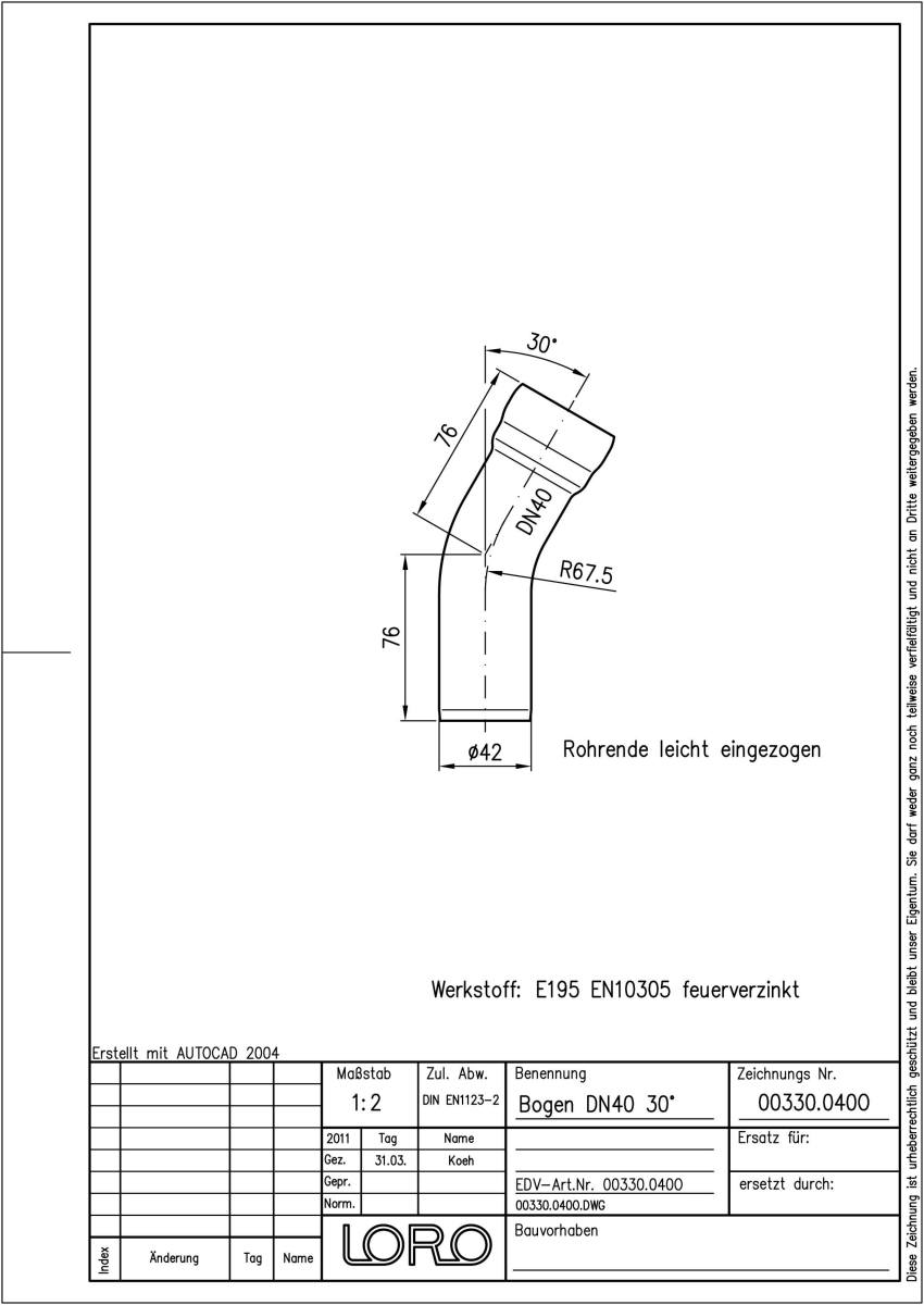LORO-X Bogen, aus Stahl, feuerverzinkt, nach DIN EN 1123 mit erhöhtem Qualitätsstandard gemäß RAL-Gütezeichen GZ-694, mit 2-Kammern-Steckmuffenverbindung, für Füll- und Entlüftungsleitungen, Baustoffklasse A1, formstabil, bruchfest, rückstausicher, ohne Innenbeschichtung, 30 Grad, DN 40