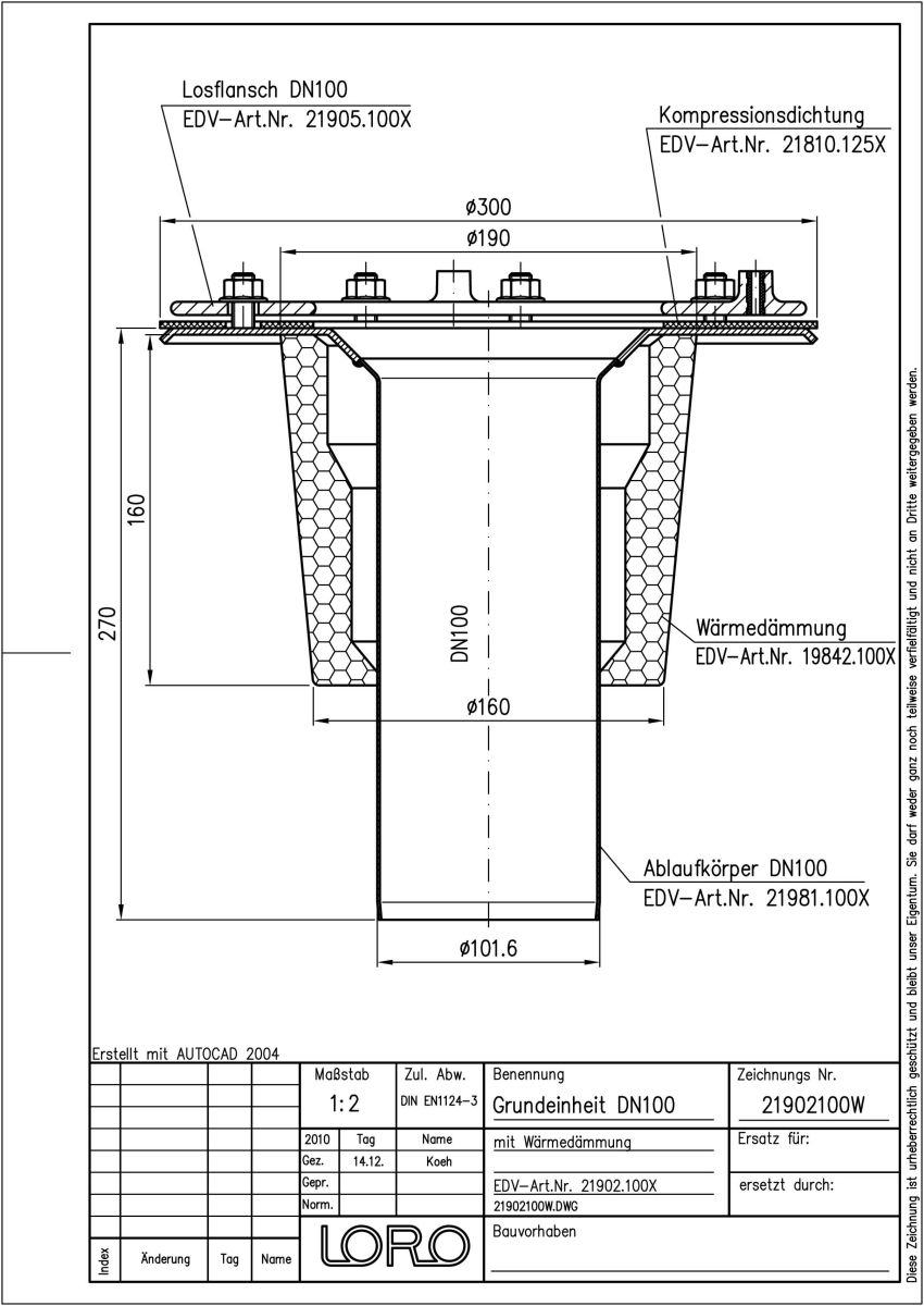 LORO-DRAINJET/LET Flachdach-Schnellablauf Grundeinheit, für Druckströmung mit planmäßiger Vollfüllung und Freispiegelströmung, nach DIN EN 1253 mit erhöhtem Qualitätsstandard gemäß RAL-Gütezeichen, mit Klemmflansch, als Los- und Festflanschkonstruktion, aus Edelstahl, Auslauf senkrecht, mit Wärmedämmung, einteilig, bestehend aus Ablauftopf, Losflansch, einschließlich Kompressionsdichtungen, DN 100