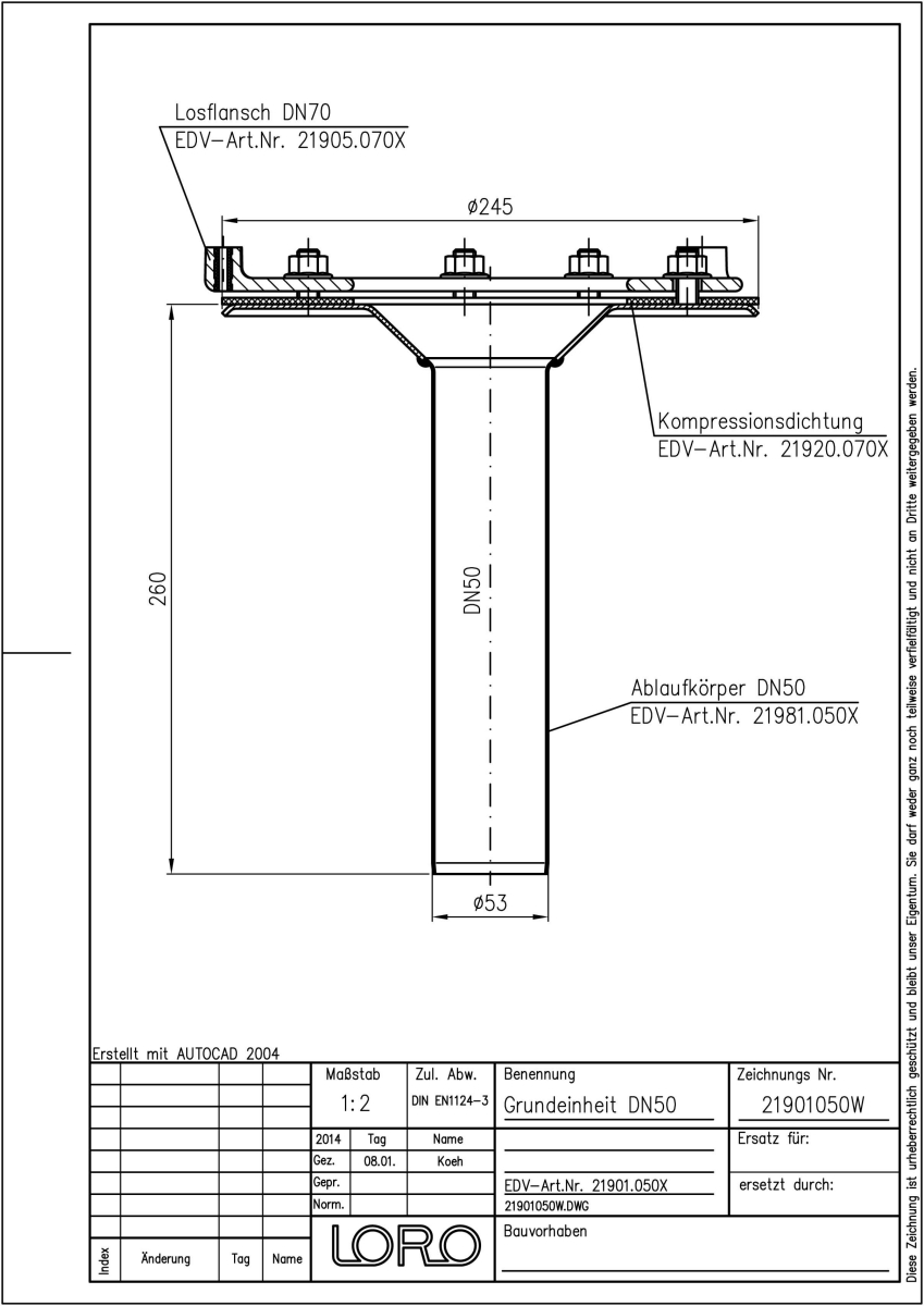 LORO-DRAINJET/LET Flachdach-Schnellablauf Grundeinheit für Druckströmung mit planmäßiger Vollfüllung und Freispiegelströmung, nach DIN EN 1253 mit erhöhtem Qualitätsstandard gemäß RAL-Gütezeichen, mit Klemmflansch, als Los- und Festflanschkonstruktion, aus Edelstahl, Auslauf senkrecht, ohne Wärmedämmung, einteilig, bestehend aus Ablauftopf, Losflansch, einschließlich Kompressionsdichtungen, DN 50