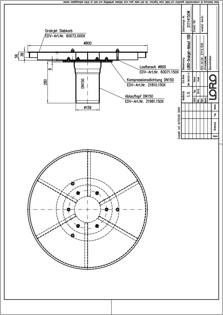 LORO-DRAINJET Hochleistungs-Dachablauf, für Druckströmung, nach DIN EN 1253 mit erhöhtem Qualitätsstandard gemäß RAL-Gütezeichen GZ-694, Serie 112, mit Klemmflansch, aus Stahl, feuerverzinkt, DN 150 bis 100 l/s