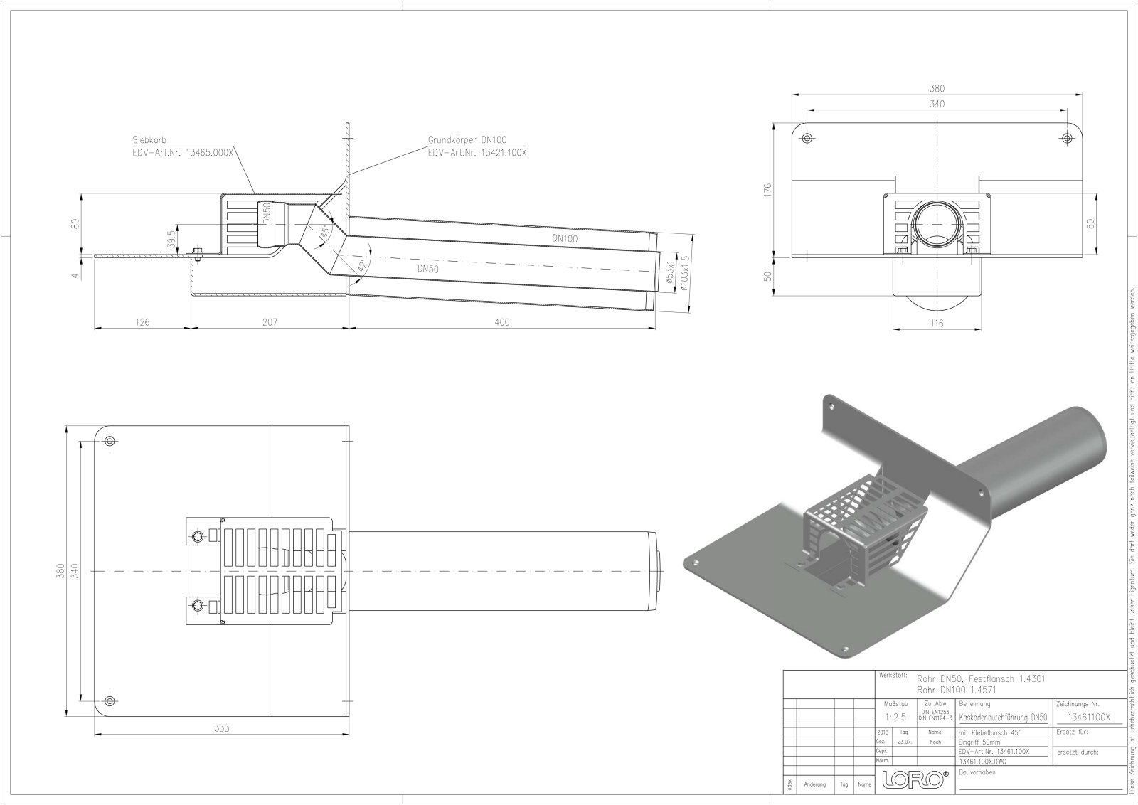 LORO-X DUOSTREAM Kaskadenentwässerung Hauptablauf für Dachterrassen, Serie 43, Attika-Direkt, Rohr in Rohr, für Hauptentwässerung mit Freispiegelströmung, Abflussleistung 2,0 l/s bei 35 mm Wasserhöhe auf der Dachterrasse, mit Klebeflansch 45 Grad Aufkantung für Bitumen-Abdichtungsbahnen, Leistungsnachweis gemäß Datenbaltt LX1981, DN 100/50