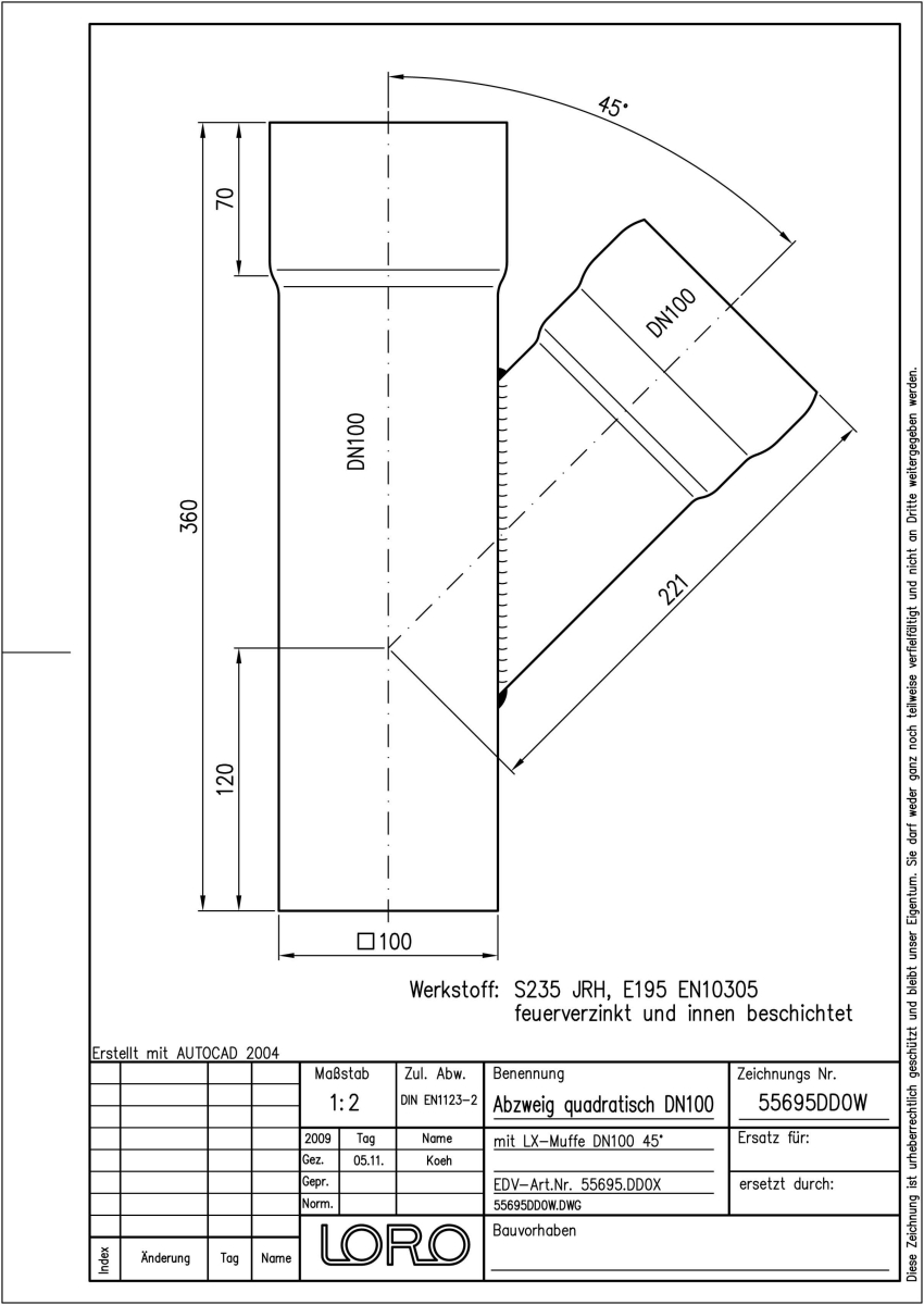 LORO-X Abzweig, aus Stahl, feuerverzinkt, nach DIN EN 1123, mit erhöhtem Qualitätsstandard gemäß RAL-Gütezeichen GZ-694, Baustoffklasse A1, formstabil, bruchfest, quadratisch/rund, langlebige Innenbeschichtung gemäß DIN EN ISO 2178 auf Basis einer 2K-Epoxid-Kombination, Farbton: Rotbraun, 45 Grad, DN 100