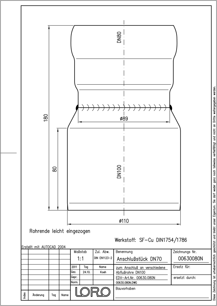 LORO-N Anschlussstück, aus Kupfer, nach DIN 1754/1786, mit erhöhtem Qualitätsstandard gemäß RAL-Gütezeichen GZ-694, zum Übergang von LORO-X Rohr DN 70 an Kunststoffrohr-Muffe DN 100, rund, mit 2-Kammern-Steckmuffenverbindung, Baustoffklasse A1, formstabil, bruchfest, rückstausicher, DN 80/100