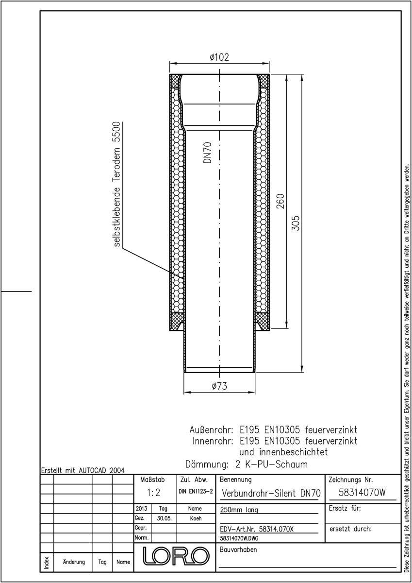 LORO-X Verbundrohr, Ausführung SILENT, für erhöhte Schalldämmung, bestehend aus: Innenrohr (LORO-X Rohr, aus Stahl, feuerverzinkt, nach DIN EN 1123, mit erhöhtem Qualitätsstandard gemäß RAL-Gütezeichen GZ-694, mit 2-Kammern-Steckmuffenverbindung, Baustoffklasse A1, formstabil, bruchfest, rückstausicher, langlebige Innenbeschichtung gemäß DIN EN ISO 2178 auf Basis einer 2K-Epoxid-Kombination, Farbton: Rotbraun), Schallschutzmatte (am Innenrohr angebracht), Dämmschicht (PU-Hartschaum B2, FCKW-frei) und Außenrohr (LORO-X Rohr, feuerverzinkt) 250 mm lang, DN 70
