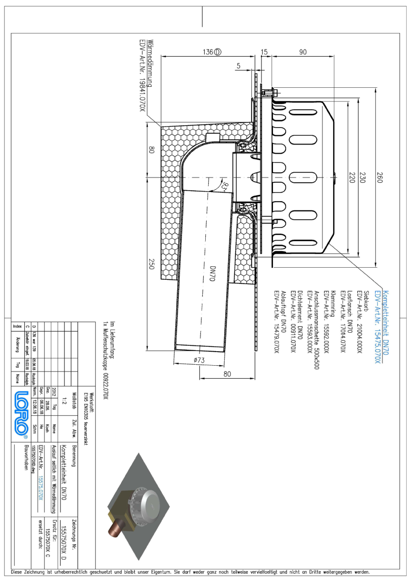 LORO-X Flachdachablauf, Serie O einteilig mit Wärmedämmung, Auslauf seitlich 3 Grad, für Hauptentwässerung mit Freispiegelströmung, Abflussleistung 4,2 l/s bei 35 mm Wasserhöhe auf dem Dach, mit Anschlussmanschette aus Bitumen/EPDM Verbund, Siebeinheit aus Edelstahl, nach DIN EN 1253 mit erhöhtem Qualitätsstandard gemäß RAL-Gütezeichen GZ-694, Leistungsnachweis mit normgerechtem Prüfsystem mit 4,2m nicht belüfteter Fallleitung gemäß LX-Datenblatt LX886, aus Stahl, feuerverzinkt, DN 70