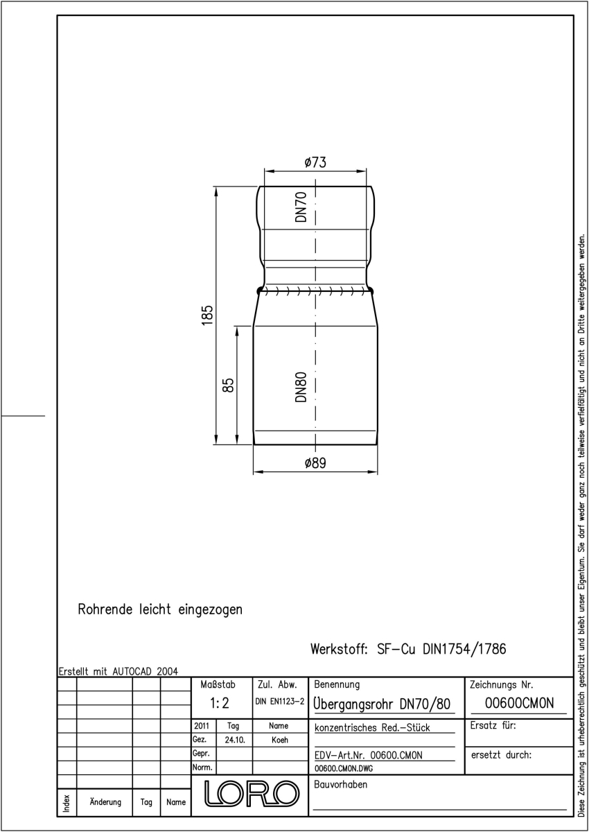 LORO-N Übergangsrohr, aus Kupfer, nach DIN 1754/1786, mit erhöhtem Qualitätsstandard gemäß RAL-Gütezeichen GZ-694, konzentrisch, rund, mit 2-Kammern-Steckmuffenverbindung, Baustoffklasse A1, formstabil, bruchfest, rückstausicher, 87 Grad, DN 70/80