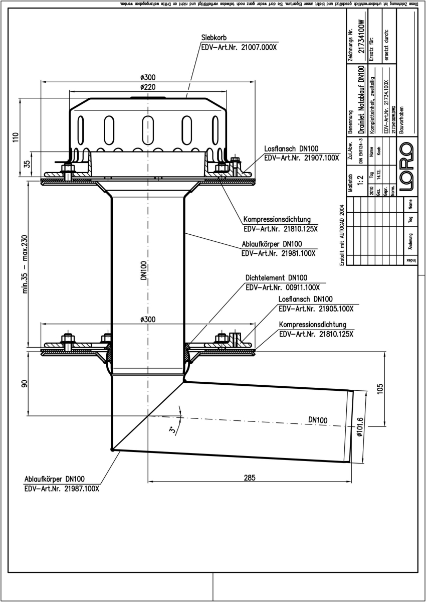 LORO-X DRAINLET Flachdachablauf, Serie 84(DL) zweiteilig ohne Wärmedämmung, Auslauf seitlich 3 Grad, für Notentwässerung mit Freispiegelströmung, Abflussleistung 11,0 l/s bei 75 mm Wasserhöhe auf dem Dach, mit Klemmflansch als Los- und Festflanschkonstruktion inklusive Kompressionsdichtungen, für Bitumen und Kunststoff Abdichtungsbahnen, DRAINLET-Haube aus Edelstahl, nach DIN EN 1253 mit erhöhtem Qualitätsstandard gemäß RAL-Gütezeichen GZ-694, Leistungsnachweis mit normgerechtem Prüfsystem mit 4,2m nicht belüfteter Fallleitung gemäß LX-Datenblatt LX854, aus Edelstahl, DN 100