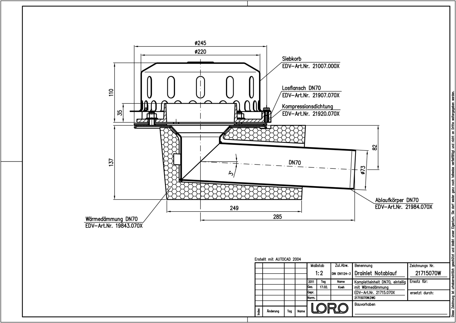 LORO-X DRAINLET Flachdachablauf, Serie 84(DL) einteilig mit Wärmedämmung, Auslauf seitlich 3 Grad, für Notentwässerung mit Freispiegelströmung, Abflussleistung 10,0 l/s bei 75 mm Wasserhöhe auf dem Dach, mit Klemmflansch als Los- und Festflanschkonstruktion inklusive Kompressionsdichtungen, für Bitumen und Kunststoff Abdichtungsbahnen, DRAINLET-Haube aus Edelstahl, nach DIN EN 1253 mit erhöhtem Qualitätsstandard gemäß RAL-Gütezeichen GZ-694, Leistungsnachweis mit normgerechtem Prüfsystem mit 4,2m nicht belüfteter Fallleitung gemäß LX-Datenblatt LX889, aus Edelstahl, DN 70