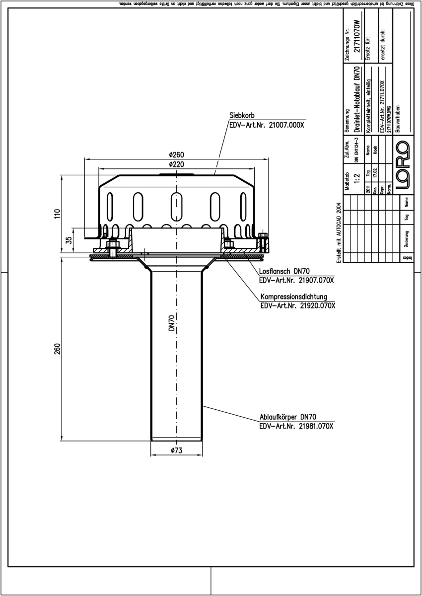 LORO-X DRAINLET Flachdachablauf, Serie 84(DL) einteilig ohne Wärmedämmung, Auslauf senkrecht, für Notentwässerung mit Freispiegelströmung, Abflussleistung 9,0 l/s bei 75 mm Wasserhöhe auf dem Dach, mit Klemmflansch als Los- und Festflanschkonstruktion inklusive Kompressionsdichtungen, für Bitumen- und Kunststoff- Abdichtungsbahnen, DRAINLET-Haube aus Edelstahl, nach DIN EN 1253 mit erhöhtem Qualitätsstandard gemäß RAL-Gütezeichen GZ-694, Leistungsnachweis mit normgerechtem Prüfsystem mit 4,2m nicht belüfteter Fallleitung gemäß LX-Datenblatt LX848, aus Edelstahl, DN 70