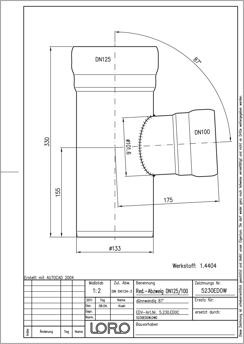 LORO-XCL Red.-Abzweig, aus Edelstahl, Werkstoff Nr. 1.4404, gebeizt und passiviert, nach DIN EN 1124 mit erhöhtem Qualitätsstandard gemäß RAL-Gütezeichen GZ-694, mit 2-Kammern-Steckmuffenverbindung, Baustoffklasse A1, formstabil, bruchfest, rückstausicher, 87 Grad, DN 125/100