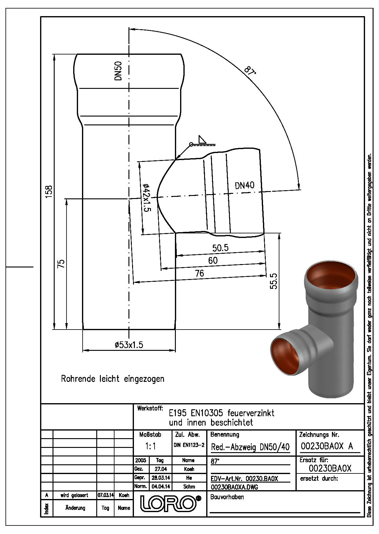 LORO-X Red.-Abzweig, aus Stahl, feuerverzinkt, nach DIN EN 1123, mit erhöhtem Qualitätsstandard gemäß RAL-Gütezeichen GZ-694, mit 2-Kammern-Steckmuffenverbindung, Baustoffklasse A1, formstabil, bruchfest, rückstausicher, langlebige Innenbeschichtung gemäß DIN EN ISO 2178 auf Basis einer 2K-Epoxid-Kombination, Farbton: Rotbraun, 87 Grad, DN 50/40