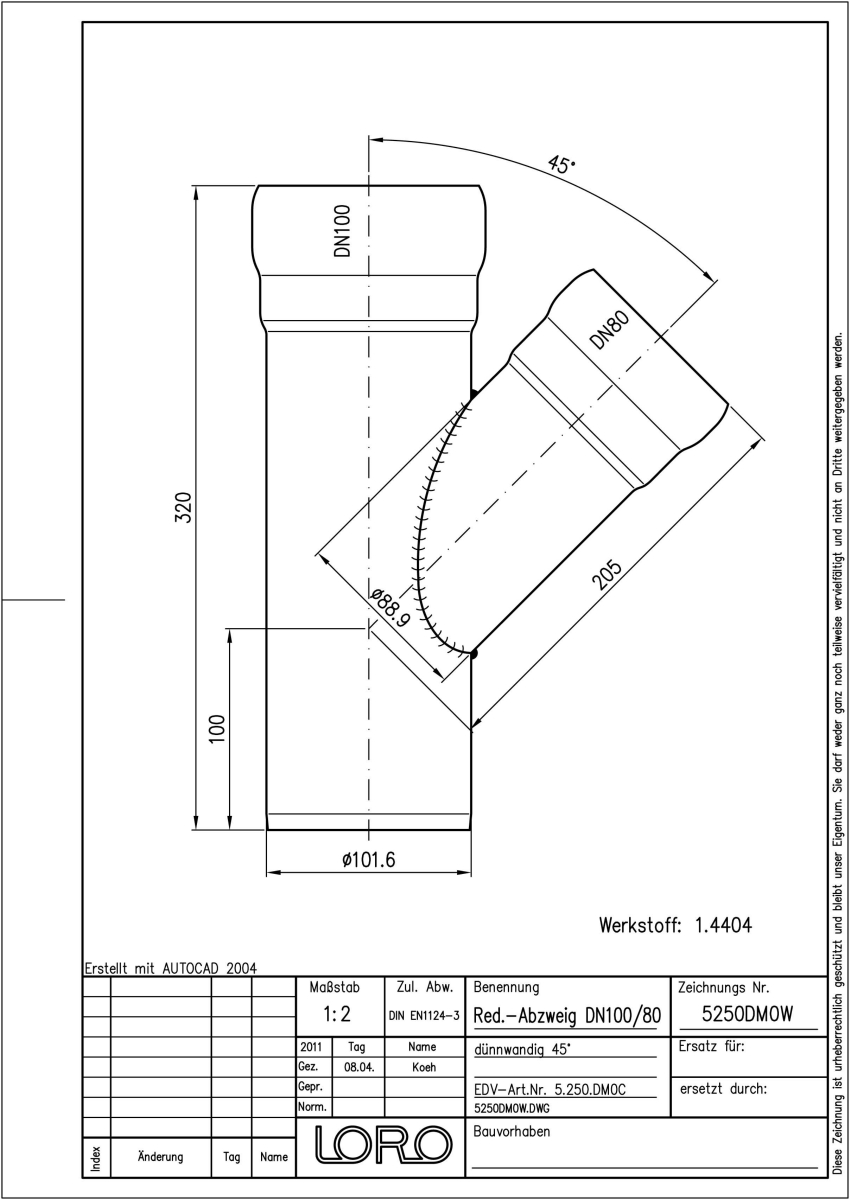 LORO-XCL Red.-Abzweig, aus Edelstahl, Werkstoff Nr. 1.4404, gebeizt und passiviert, nach DIN EN 1124 mit erhöhtem Qualitätsstandard gemäß RAL-Gütezeichen GZ-694, mit 2-Kammern-Steckmuffenverbindung, Baustoffklasse A1, formstabil, bruchfest, rückstausicher, 45 Grad, DN 100/80