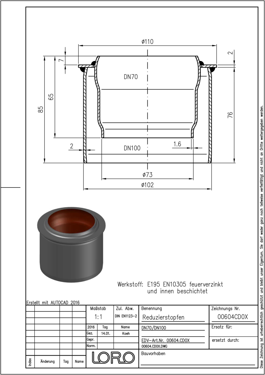 LORO-X Red.-Stück, aus Stahl, feuerverzinkt, konzentrisch, versenkt nach DIN EN 1123 mit erhöhtem Qualitätsstandard gemäß RAL-Gütezeichen GZ-694, mit 2-Kammern-Steckmuffenverbindung, Baustoffklasse A1, formstabil, bruchfest, rückstausicher, langlebige Innenbeschichtung gemäß DIN EN ISO 2178 auf Basis einer 2K-Epoxid-Kombination, Farbton: Rotbraun, DN 70/100