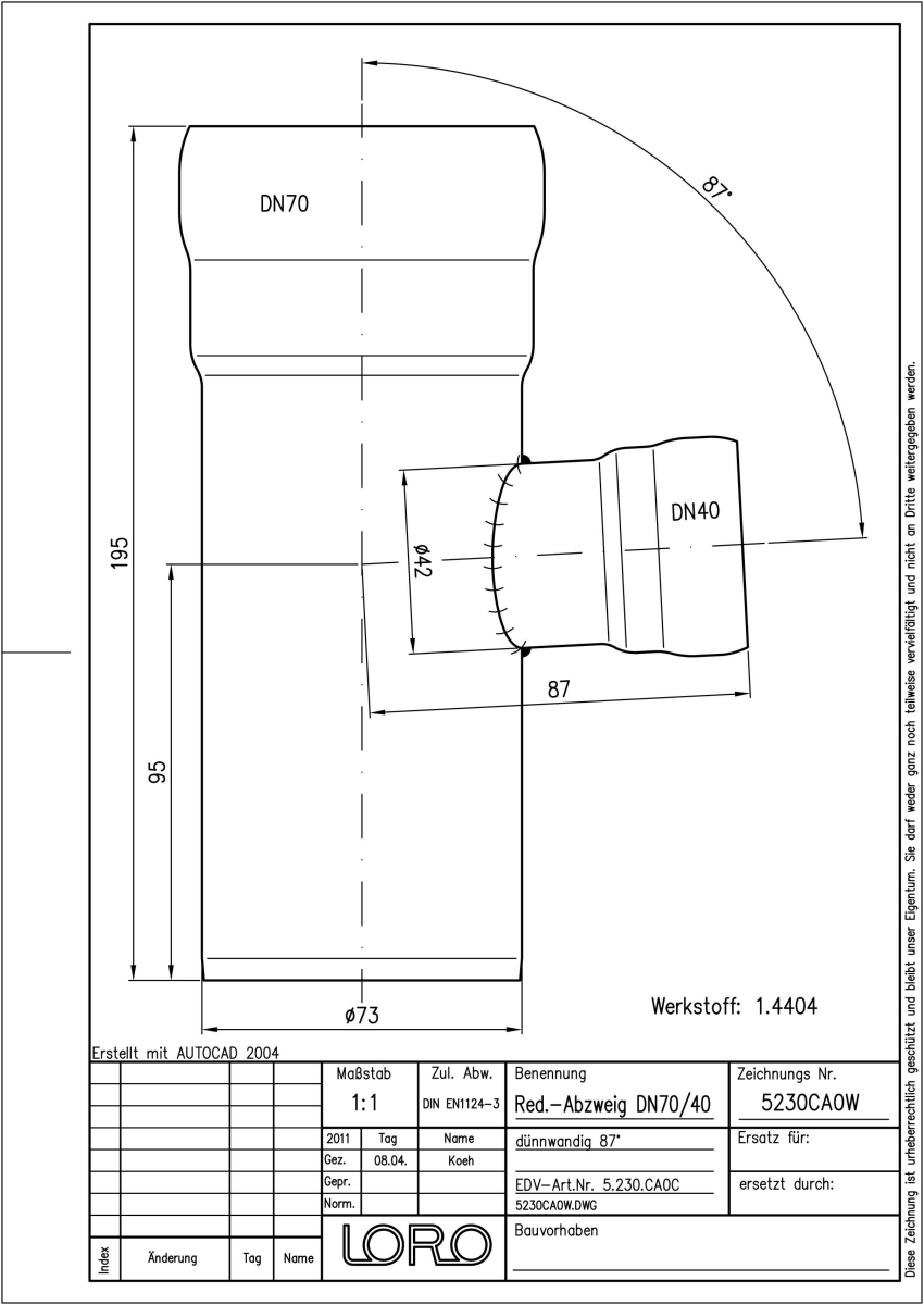 LORO-XCL Red.-Abzweig, aus Edelstahl, Werkstoff Nr. 1.4404, gebeizt und passiviert, nach DIN EN 1124 mit erhöhtem Qualitätsstandard gemäß RAL-Gütezeichen GZ-694, mit 2-Kammern-Steckmuffenverbindung, Baustoffklasse A1, formstabil, bruchfest, rückstausicher, 87 Grad, DN 70/40