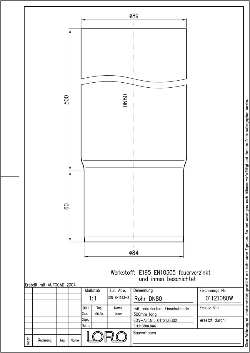 LORO-X Red.-Steck Regenfallrohr, aus Stahl, feuerverzinkt, rund, ohne Muffe, mit reduziertem Einschubende, Baustoffklasse A1, formstabil, bruchfest, 500 mm, DN 80