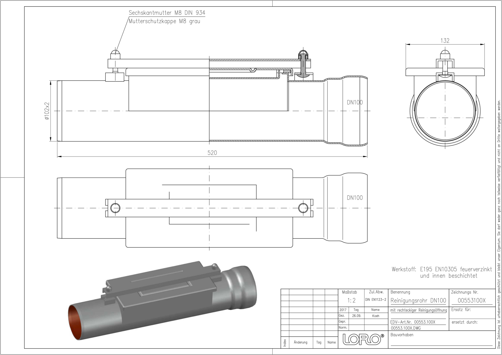 LORO-X Reinigungsrohr, aus Stahl, feuerverzinkt, mit rechteckiger Reinigungsöffnung, nach DIN EN 1123 mit erhöhtem Qualitätsstandard gemäß RAL-Gütezeichen GZ-694, mit 2-Kammern-Steckmuffenverbindung, Baustoffklasse A1, formstabil, bruchfest, rückstausicher, langlebige Innenbeschichtung gemäß DIN EN ISO 2178 auf Basis einer 2K-Epoxid-Kombination, Farbton: Rotbraun, DN 100