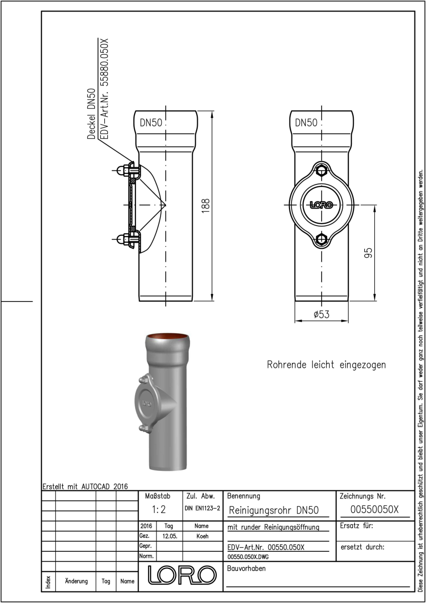 LORO-X Reinigungsrohr, aus Stahl, feuerverzinkt, mit runder Reinigungsöffnung, nach DIN EN 1123 mit erhöhtem Qualitätsstandard gemäß RAL-Gütezeichen GZ-694, mit 2-Kammern-Steckmuffenverbindung, Baustoffklasse A1, formstabil, bruchfest, rückstausicher, langlebige Innenbeschichtung gemäß DIN EN ISO 2178 auf Basis einer 2K-Epoxid-Kombination, Farbton: Rotbraun, DN 50