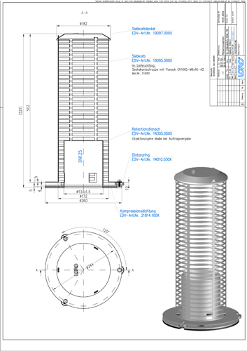 LORO-X VARIOFIT Strömungshilfe für Retentionsdachentwässerung, Siebkorb 500 mm, objektbezogene Ausführung, für die Ermittlung der erforderlichen Retentionsöffnungen bitte Kontakt mit dem LOROWERK aufnehmen, für die Hauptentwässerung und höhenvariablem Retentionsrohr, passend für Attikaabläufe Serie 79, 88 und 89, DN 50 bis DN 100