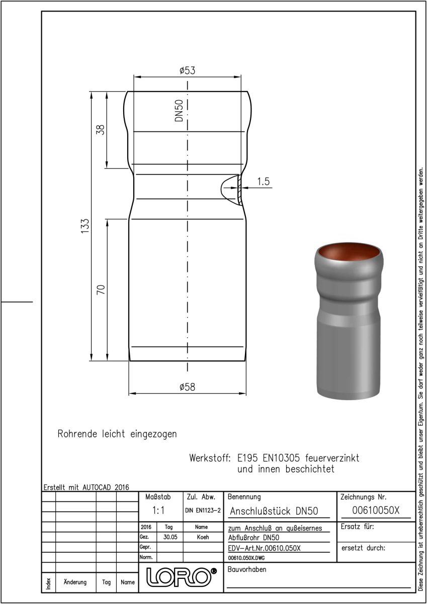 LORO-X Anschlussstück aus Stahl, feuerverzinkt, von LORO-X Rohr DN 50 an SML-Rohr DN 50, nach DIN EN 1123 mit erhöhtem Qualitätsstandard gemäß RAL-Gütezeichen GZ 694, mit 2-Kammern-Steckmuffenverbindung, Baustoffklasse A1, formstabil, bruchfest, rückstausicher, langlebige Innenbeschichtung gemäß DIN EN ISO 2178 auf Basis einer 2K-Epoxid-Kombination, Farbton: Rotbraun, DN 50/50