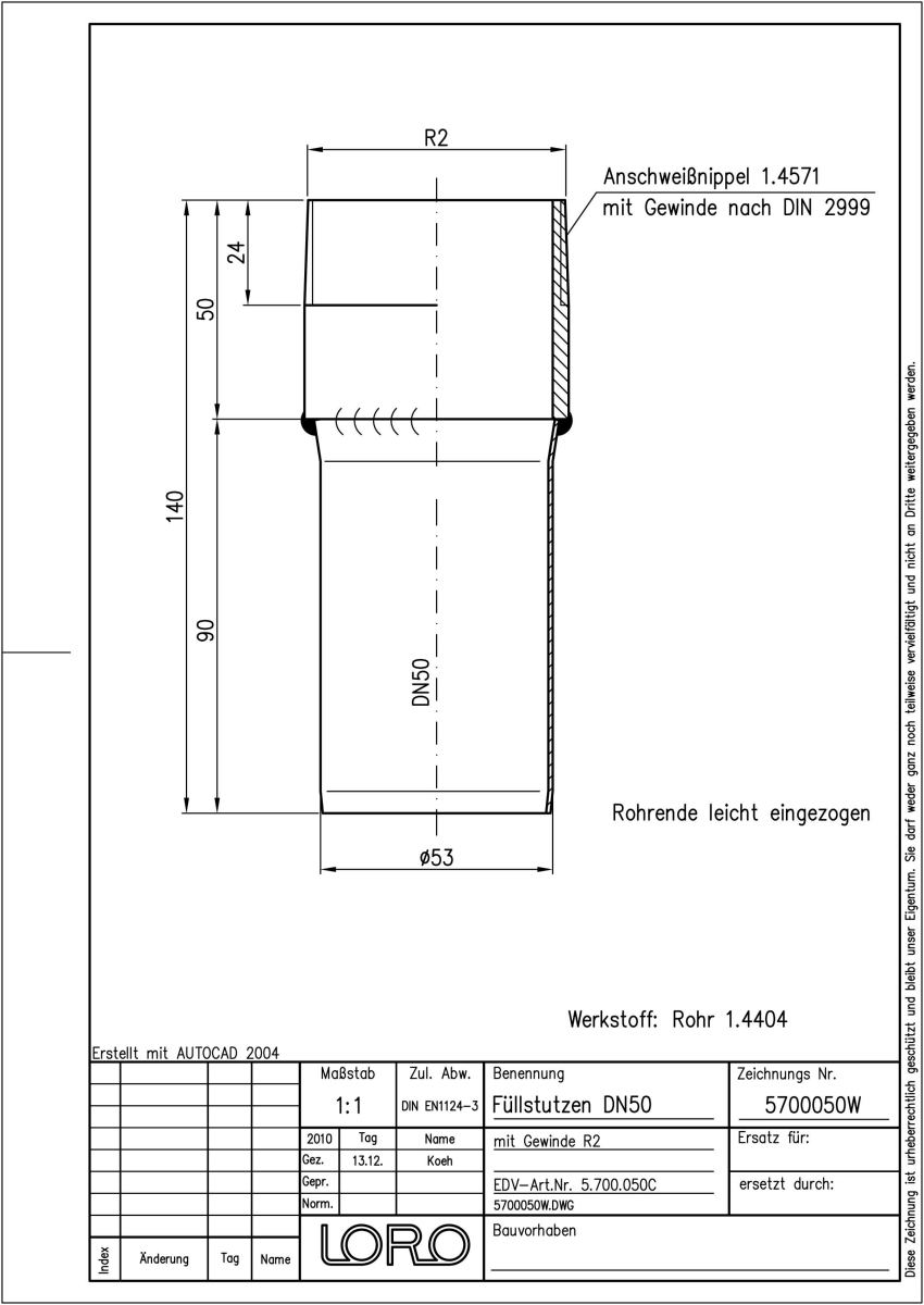 LORO-XCL Anschlussstück mit Außengewinde 2 Zoll, aus Edelstahl, Werkstoff 1.4404, gebeizt und passiviert, DN 50