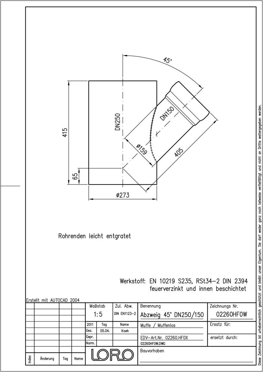 DN 250/150, 45°, fvz
