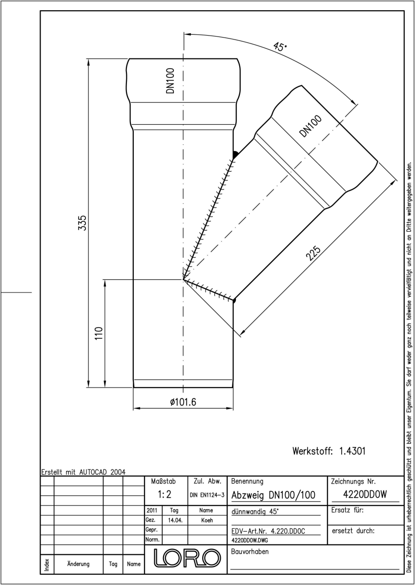 LORO-XCL Abzweig, aus Edelstahl, Werkstoff Nr. 1.4301, gebeizt und passiviert, nach DIN EN 1124 mit erhöhtem Qualitätsstandard gemäß RAL-Gütezeichen GZ-694, mit 2-Kammern-Steckmuffenverbindung, Baustoffklasse A1, formstabil, bruchfest, rückstausicher, 45 Grad, DN 100