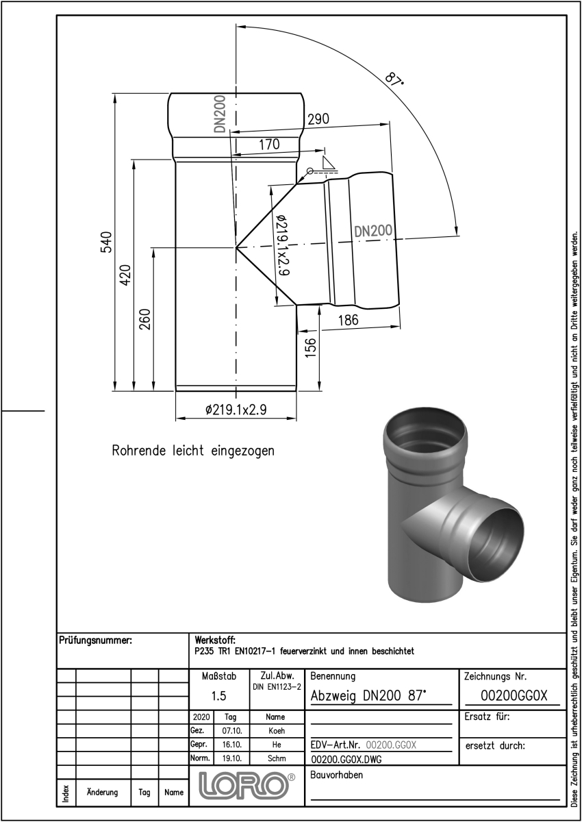 LORO-X Abzweig, aus Stahl, feuerverzinkt, nach DIN EN 1123, mit erhöhtem Qualitätsstandard gemäß RAL-Gütezeichen GZ-694, mit 2-Kammern-Steckmuffenverbindung, Baustoffklasse A1, formstabil, bruchfest, rückstausicher, langlebige Innenbeschichtung gemäß DIN EN ISO 2178 auf Basis einer 2K-Epoxid-Kombination, Farbton: Rotbraun, 87 Grad, DN 200