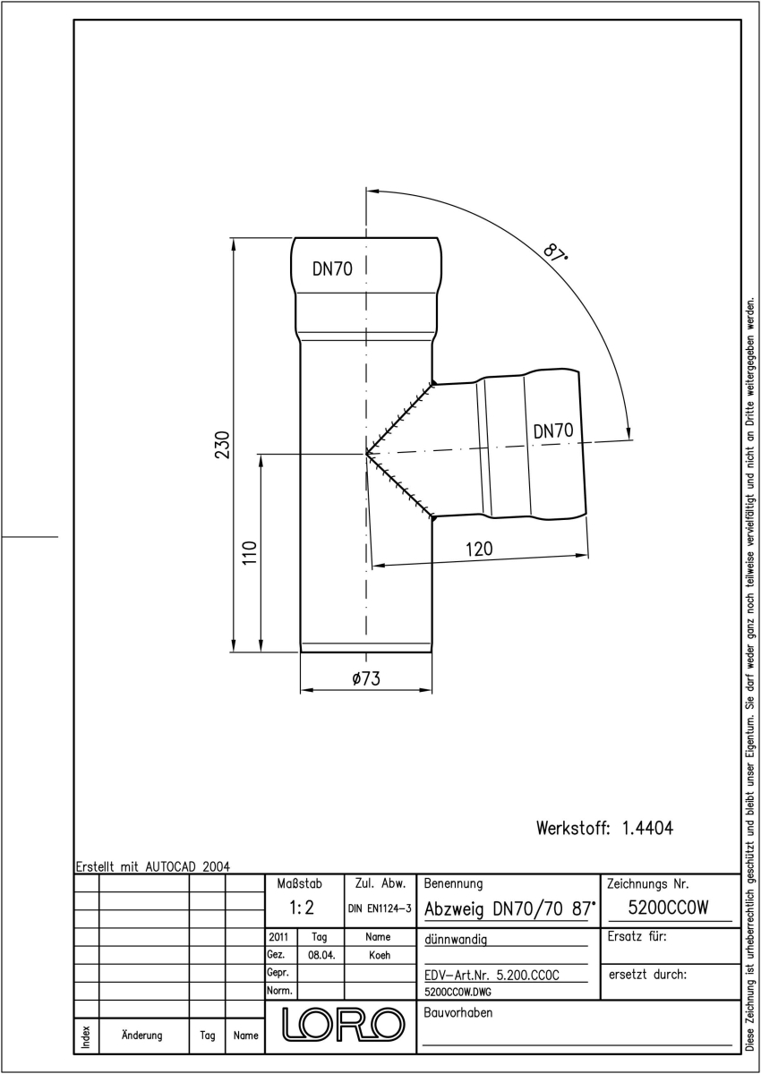 LORO-XCL Abzweig, aus Edelstahl, Werkstoff Nr. 1.4404, gebeizt und passiviert, nach DIN EN 1124 mit erhöhtem Qualitätsstandard gemäß RAL-Gütezeichen GZ-694, mit 2-Kammern-Steckmuffenverbindung, Baustoffklasse A1, formstabil, bruchfest, rückstausicher, 87 Grad, DN 70