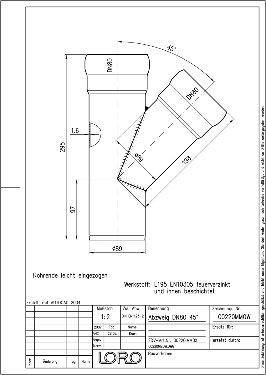 LORO-X Abzweig, aus Stahl, feuerverzinkt, nach DIN EN 1123, mit erhöhtem Qualitätsstandard gemäß RAL-Gütezeichen GZ-694, mit 2-Kammern-Steckmuffenverbindung, Baustoffklasse A1, formstabil, bruchfest, rückstausicher, langlebige Innenbeschichtung gemäß DIN EN ISO 2178 auf Basis einer 2K-Epoxid-Kombination, Farbton: Rotbraun, 45 Grad, DN 80