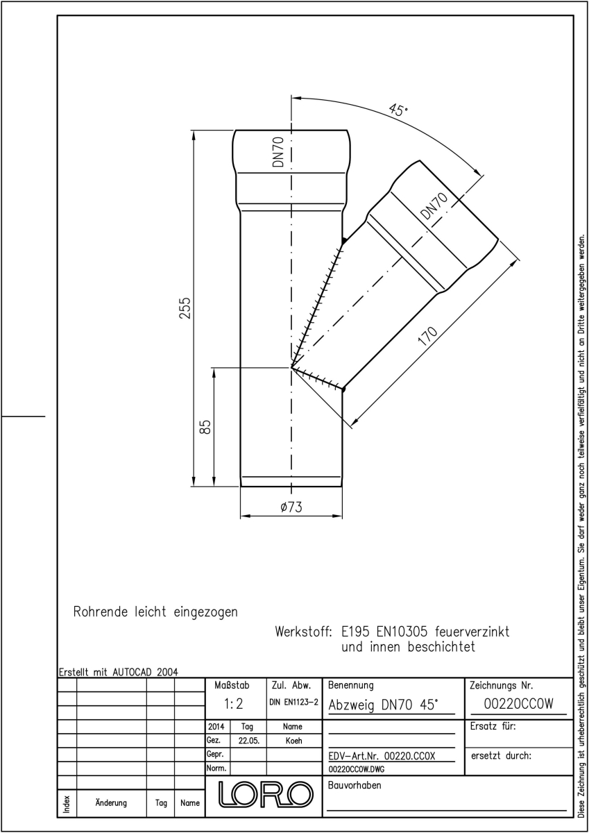 LORO-X Abzweig, aus Stahl, feuerverzinkt, nach DIN EN 1123, mit erhöhtem Qualitätsstandard gemäß RAL-Gütezeichen GZ-694, mit 2-Kammern-Steckmuffenverbindung, Baustoffklasse A1, formstabil, bruchfest, rückstausicher, langlebige Innenbeschichtung gemäß DIN EN ISO 2178 auf Basis einer 2K-Epoxid-Kombination, Farbton: Rotbraun, 45 Grad, DN 70
