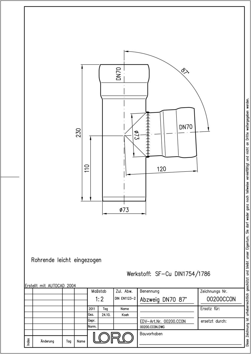 LORO-N Abzweig, aus Kupfer, nach DIN 1754/1786, mit erhöhtem Qualitätsstandard gemäß RAL-Gütezeichen GZ-694, mit 2-Kammern-Steckmuffenverbindung, Baustoffklasse A1, formstabil, bruchfest, rückstausicher, 87 Grad, DN 70