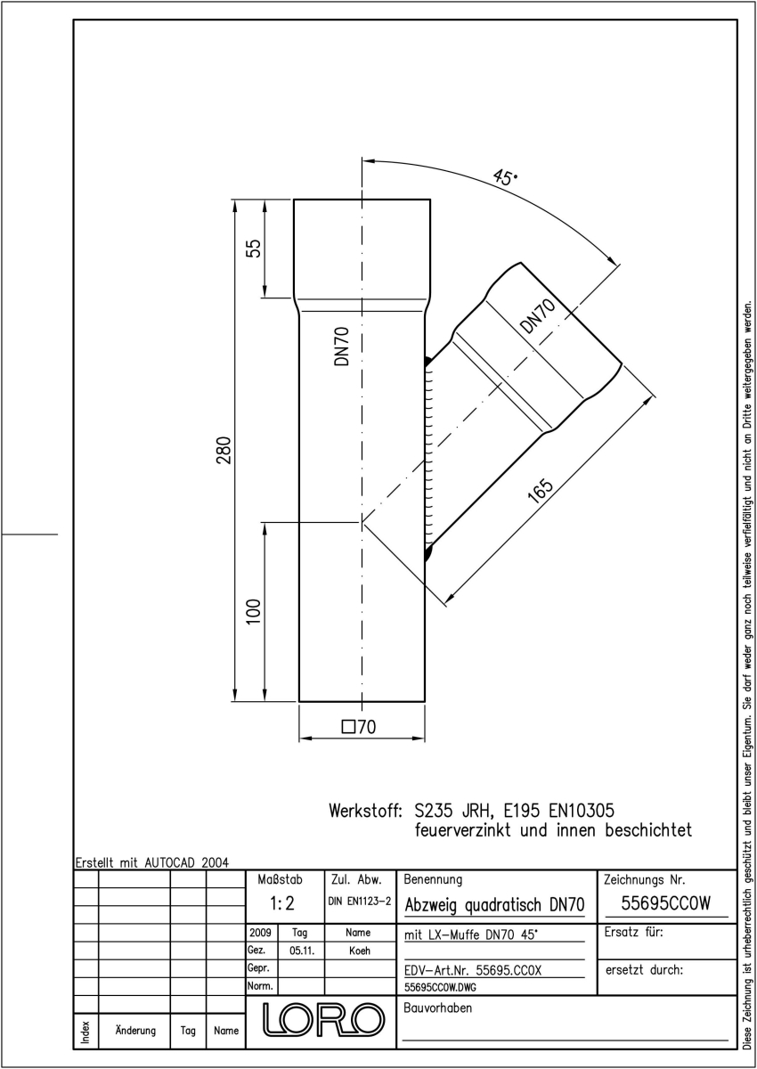 LORO-X Abzweig, aus Stahl, feuerverzinkt, nach DIN EN 1123, mit erhöhtem Qualitätsstandard gemäß RAL-Gütezeichen GZ-694, Baustoffklasse A1, formstabil, bruchfest, quadratisch/rund, langlebige Innenbeschichtung gemäß DIN EN ISO 2178 auf Basis einer 2K-Epoxid-Kombination, Farbton: Rotbraun, 45 Grad, DN 70