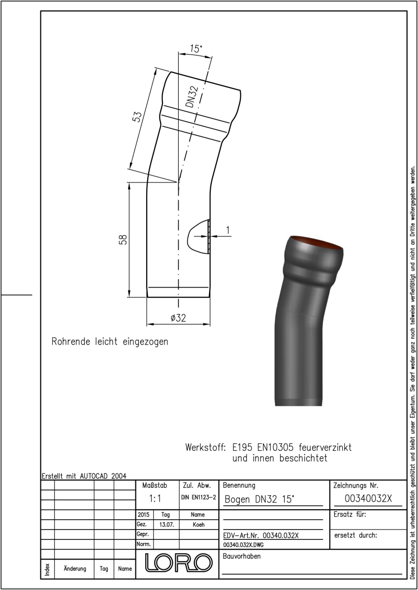LORO-X Bogen, aus Stahl, feuerverzinkt, nach DIN EN 1123 mit erhöhtem Qualitätsstandard gemäß RAL-Gütezeichen GZ-694, mit 2-Kammern-Steckmuffenverbindung, Baustoffklasse A1, formstabil, bruchfest, rückstausicher, langlebige Innenbeschichtung gemäß DIN EN ISO 2178 auf Basis einer 2K-Epoxid-Kombination, Farbton: Rotbraun, 15 Grad, DN 32