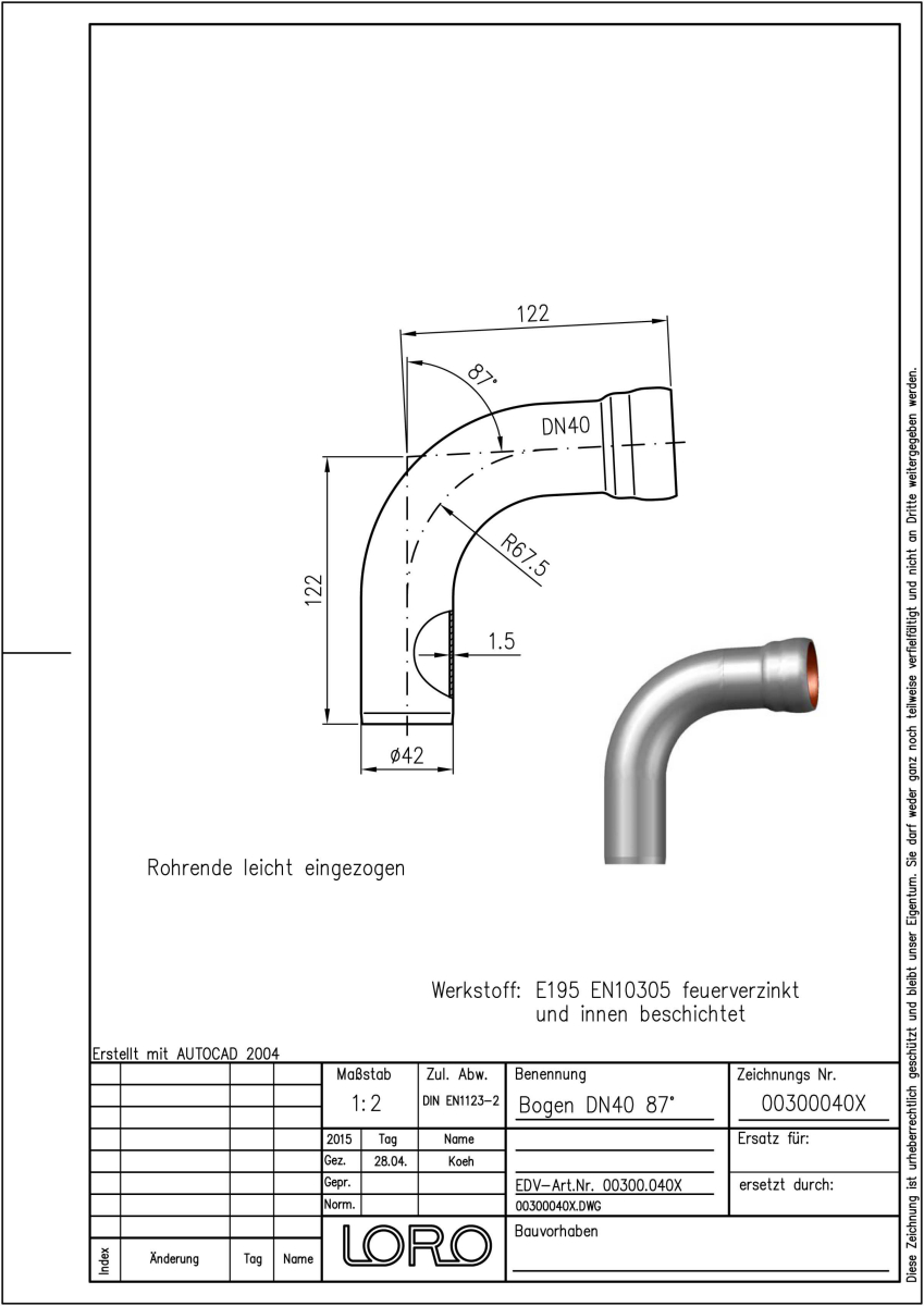 LORO-X Bogen, aus Stahl, feuerverzinkt, nach DIN EN 1123 mit erhöhtem Qualitätsstandard gemäß RAL-Gütezeichen GZ-694, mit 2-Kammern-Steckmuffenverbindung, Baustoffklasse A1, formstabil, bruchfest, rückstausicher, langlebige Innenbeschichtung gemäß DIN EN ISO 2178 auf Basis einer 2K-Epoxid-Kombination, Farbton: Rotbraun, 87 Grad, DN 40