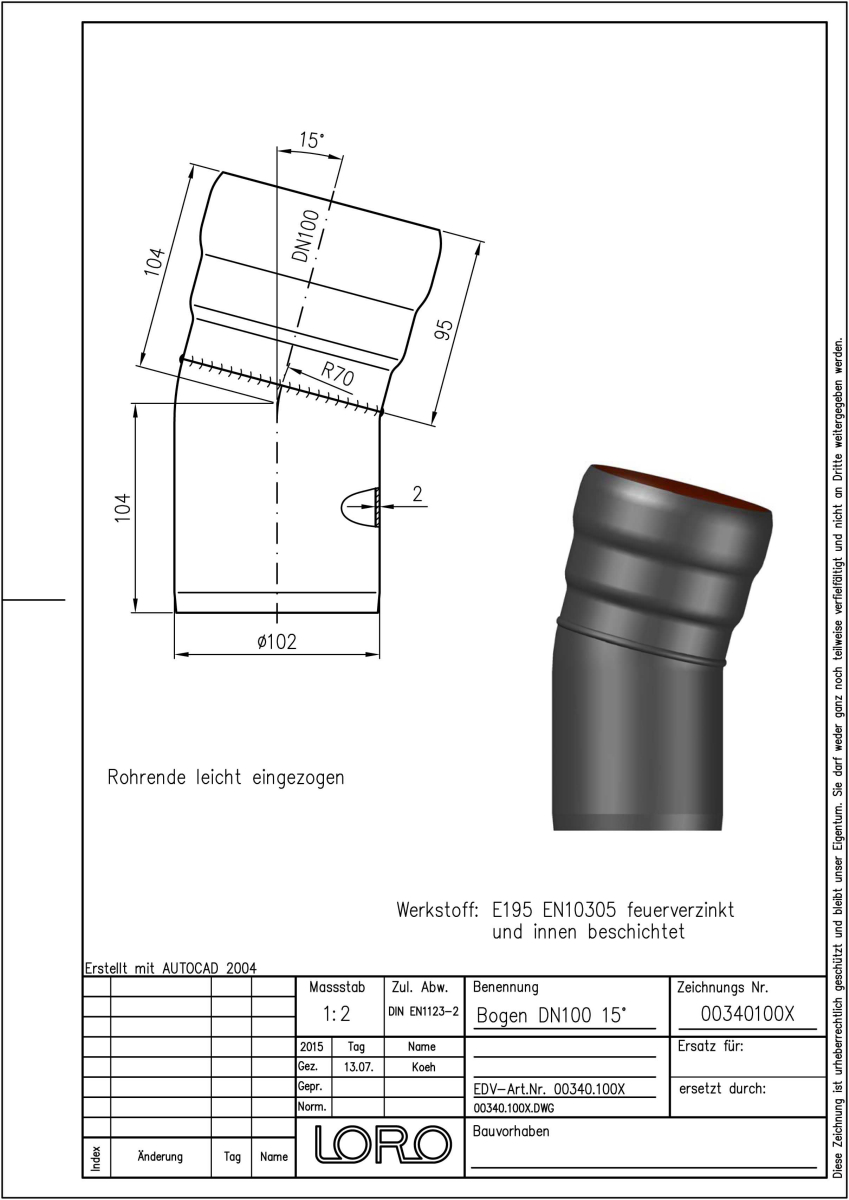 LORO-X Bogen, aus Stahl, feuerverzinkt, nach DIN EN 1123 mit erhöhtem Qualitätsstandard gemäß RAL-Gütezeichen GZ-694, mit 2-Kammern-Steckmuffenverbindung, Baustoffklasse A1, formstabil, bruchfest, rückstausicher, langlebige Innenbeschichtung gemäß DIN EN ISO 2178 auf Basis einer 2K-Epoxid-Kombination, Farbton: Rotbraun, 15 Grad, DN 100