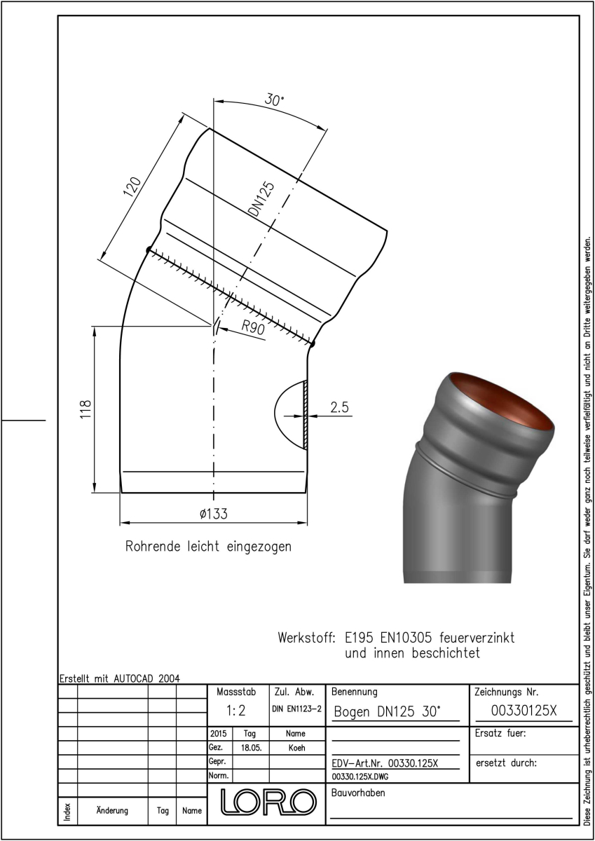 LORO-X Bogen, aus Stahl, feuerverzinkt, nach DIN EN 1123 mit erhöhtem Qualitätsstandard gemäß RAL-Gütezeichen GZ-694, mit 2-Kammern-Steckmuffenverbindung, Baustoffklasse A1, formstabil, bruchfest, rückstausicher, langlebige Innenbeschichtung gemäß DIN EN ISO 2178 auf Basis einer 2K-Epoxid-Kombination, Farbton: Rotbraun, 30 Grad, DN 125